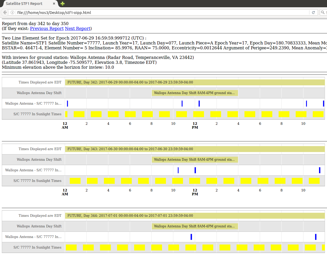 | Orbit, Inview, and Power Planning (OIPP) | OIPP is a planning tool developed by members of the NASA IV&V team that allows the ground station to know when the satellite will be in view, as well as when the satellite will be in direct sunlight. This allowed the IV&V team to plan STF-1 power usage and communication times. Right-click on the OIPP image to the right to open it in a new tab. Note: You will see that the blue areas are available communication times, while the yellow areas are times when STF-1 would be in direct sunlight. |